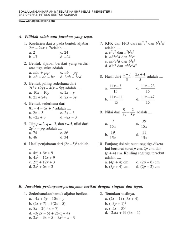 Soal Matematika Aljabar Smp Kelas 7 Kunci Dunia